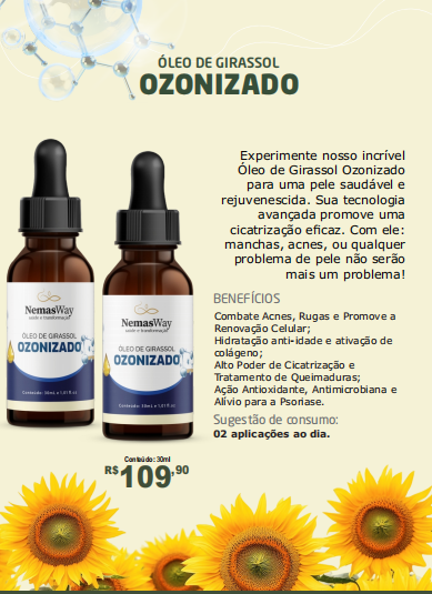 Óleo de Girassol Ozonizado para uma pele saudável e rejuvenescida. Sua tecnologia avançada promove uma cicatrização eficaz.