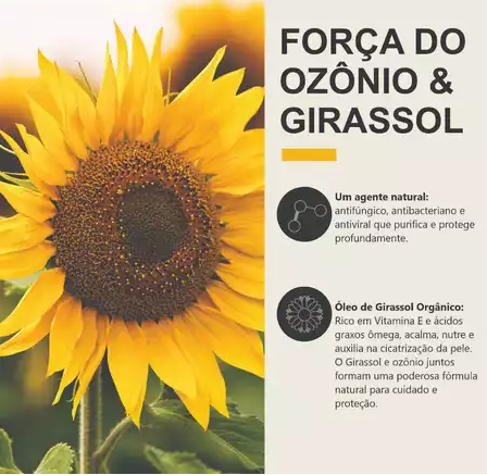 O GiraOzon é o puro óleo de girassol orgânico enriquecido com Ozônio (Oxigênio Ativo - O3), rico em Vitamina E e A.G.E (ácidos graxos essenciais - Ômega 6 e 9).