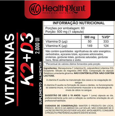 A combinação de Vitamina D3 (2000UI) e Vitamina K2 (149mcg) foi cuidadosamente formulada para atender às dosagens recomendadas pelos órgãos reguladores, garantindo um suplemento seguro e eficaz para complementar sua rotina diária.