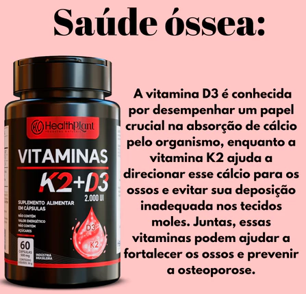 Atuação sinérgica – A Vitamina D3 auxilia na absorção de cálcio, enquanto a Vitamina K2 contribui para sua distribuição correta no organismo.
